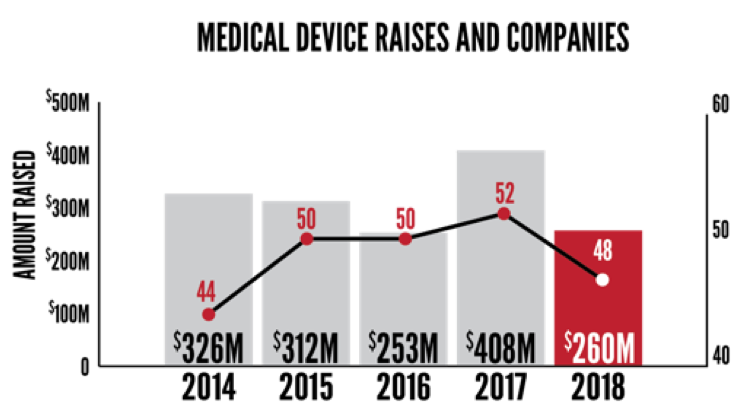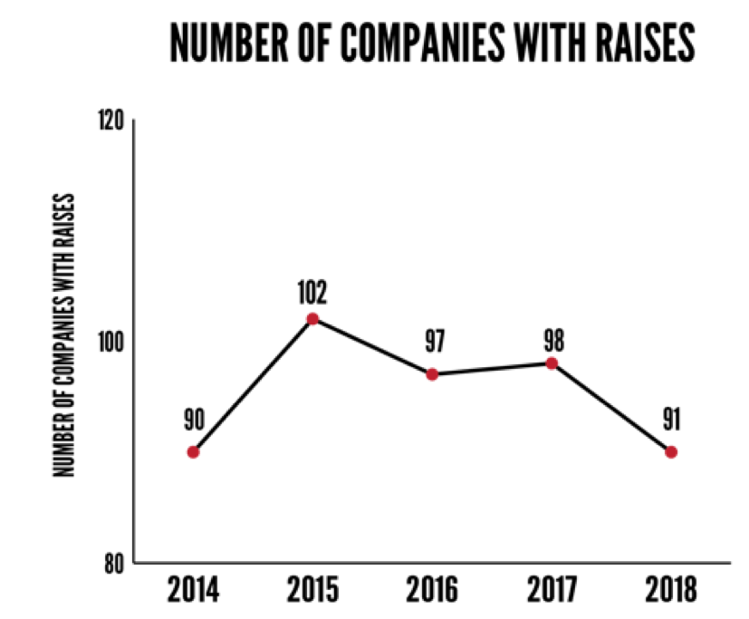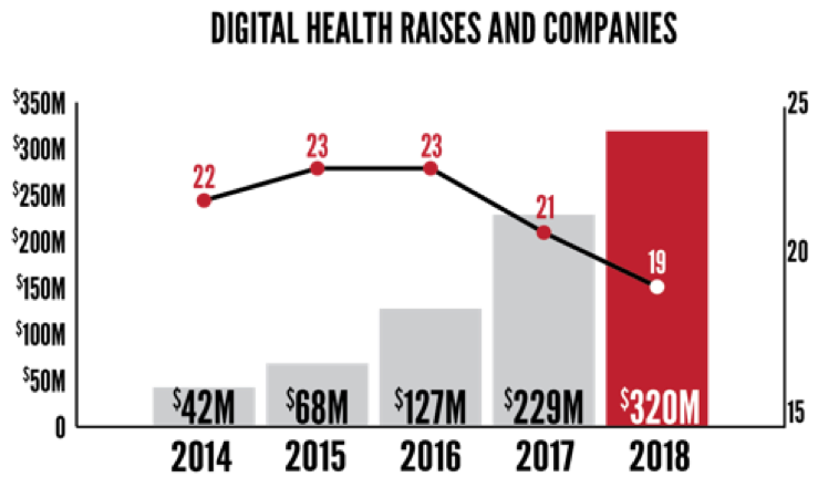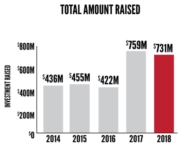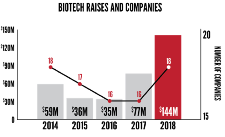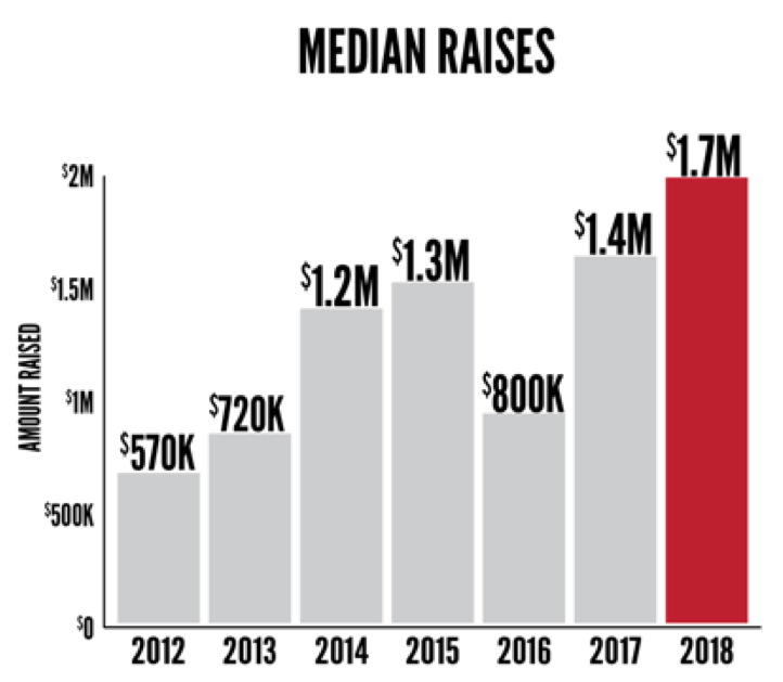 In 2018 $731 million was raised by 91 companies, nearly equaling 2017’s all-time record of $759 million. Bright Health’s $200 million raise led the way and was the largest fundraise in the Midwest according to VentureBeat. Bind’s $70 million and Relievant Medsystem’s $58 million rounded out the top 3. In all, 19 companies raised $10 million or more in 2018.