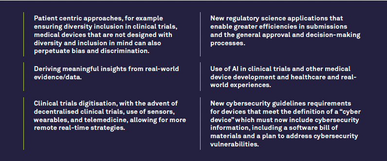 In general, we are witnessing a regulatory revolution that seeks to modernise and enhance patient safety and public health by implementing greater oversight and monitoring, traceability, transparency, and a risk-based classification system for medical devices. Regulators are embracing innovation in medical device development and issuing new guidelines in several key areas.